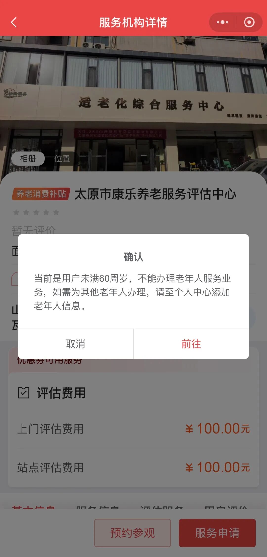 点击“服务申请”后,如果页面弹出要求添加老年人信息的对话框,点击对话框中的“前往”按钮,进入“个人中心”页面。